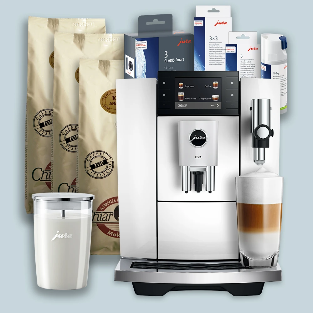 Med Jura E8 (ED) Piano White pakketilbud får du en af Juras mest efterspurgte espressomaskiner – E8 – samlet med kaffe, filtre og plejeprodukter, der gør det let at komme i gang med maskinen.