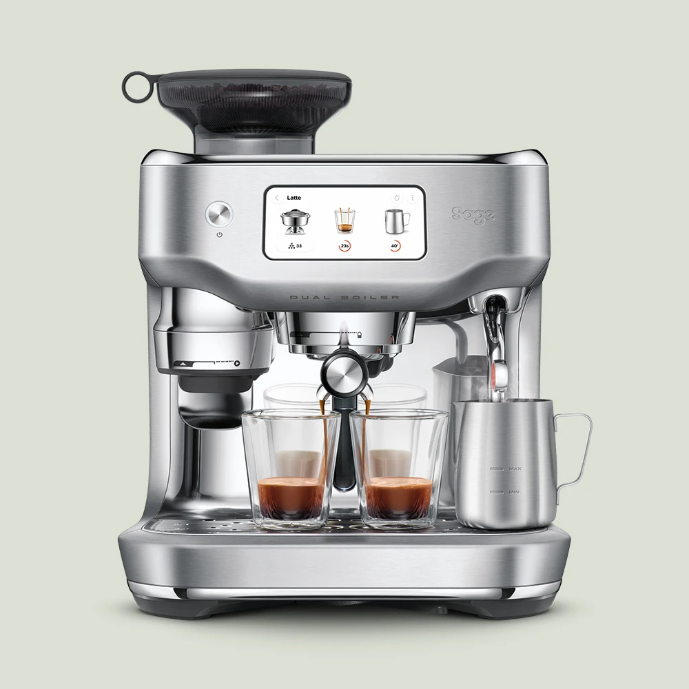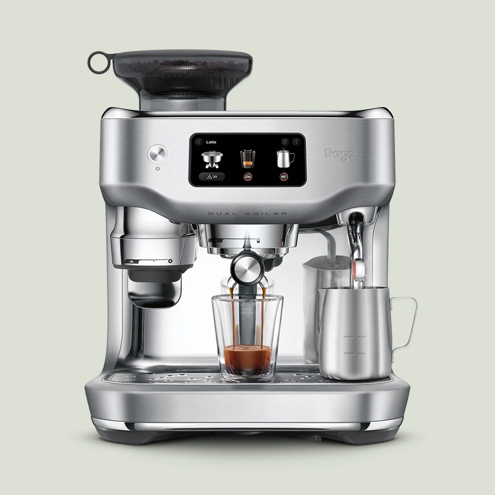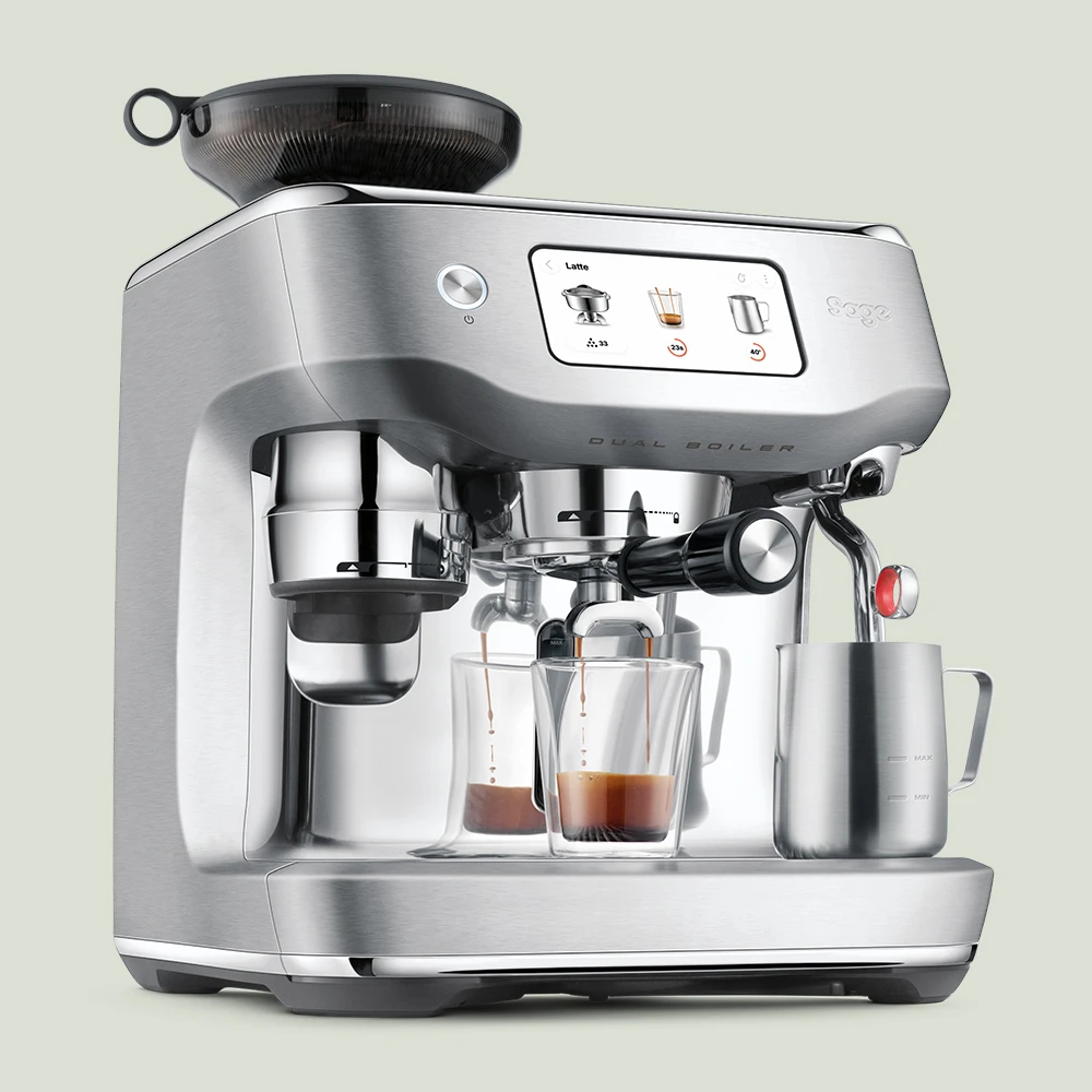 Sage The Oracle Dual Boiler SES995BSS er Sages mest avancerede espressomaskine til hjemmebrug. Maskinen er udstyret med to separate kedler, integreret Baratza-kværn samt automatisk dosering og tamping, som tilsammen giver et effektivt og stabilt workflow.